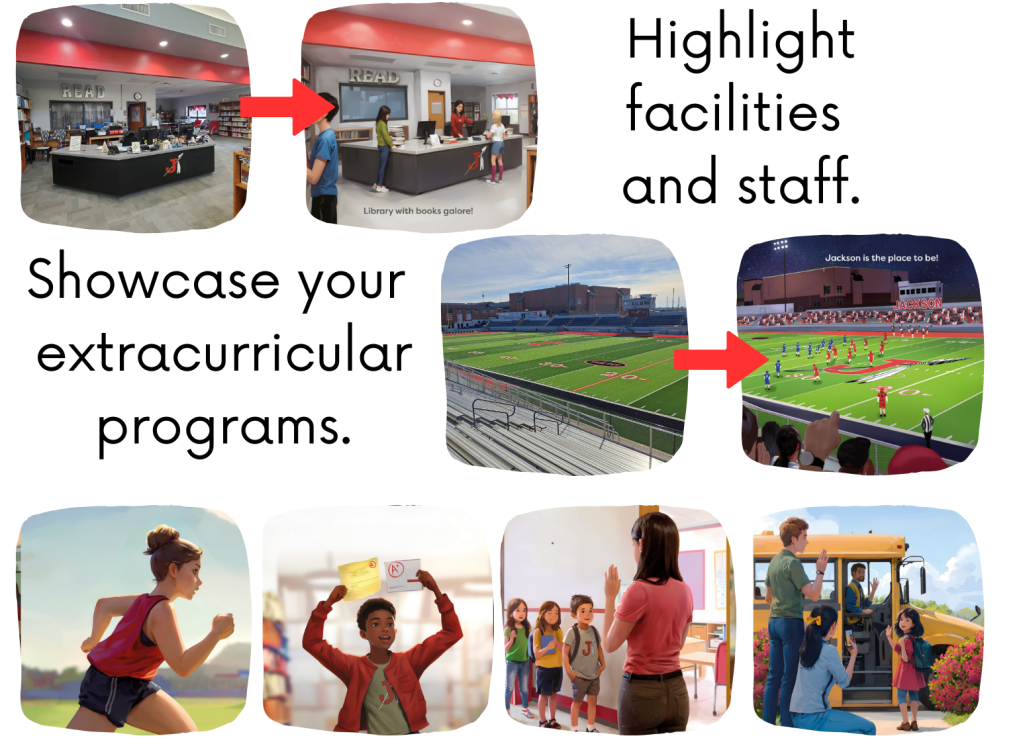 - Customized text and professional illustrations showcase your school and community